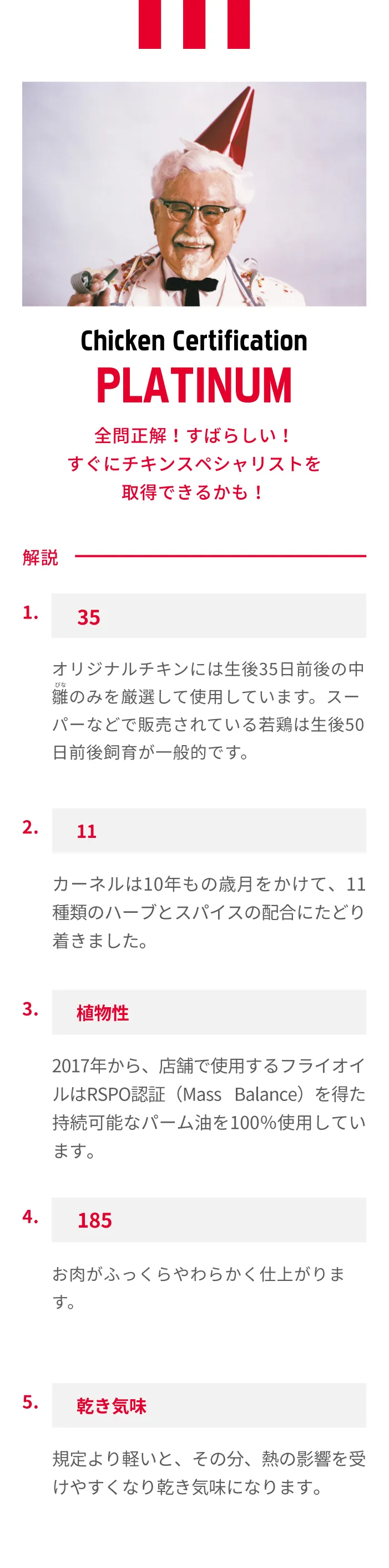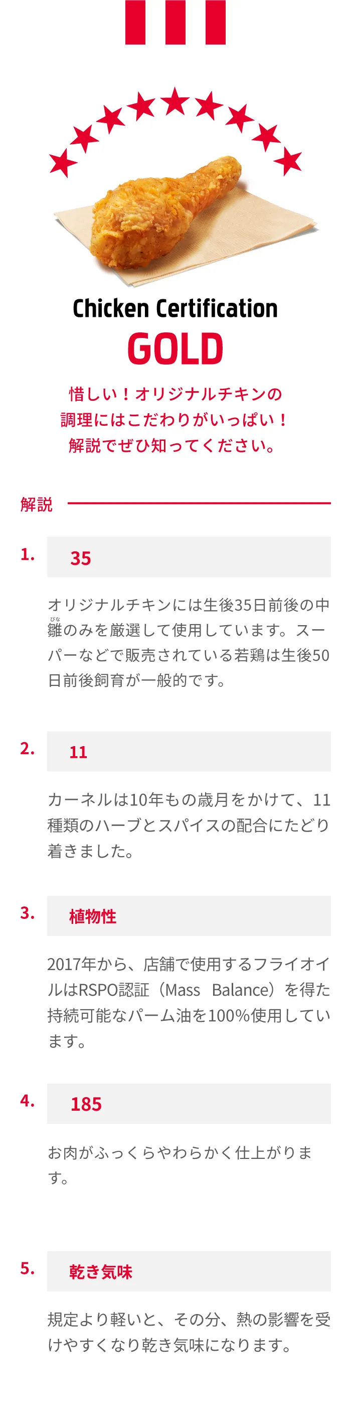 オリジナルチキンの調理担当者は、KFC独自の認定資格「チキンスペシャリスト」を取得することが義務づけられています。