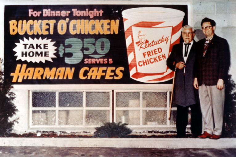 当時、カーネルは生涯の親友となる青年と出会いました。ユタ州ソルトレイクシティでレストランを経営していたピート・ハーマンです。ある日、ピートの自宅に招かれたカーネルは夕食にフライドチキンをふるまいます。そのおいしさに心底感動したピートは、カーネルのフライドチキンを自身のレストランのメニューに加えることを提案します。