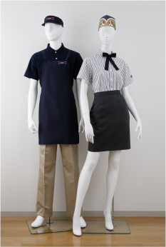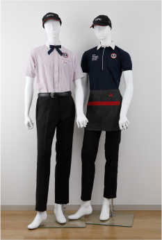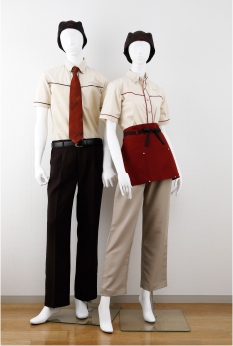 全ての従業員がパンツスタイルに。ネクタイやエプロンの赤がポイントカラー。