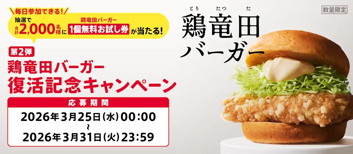 鶏竜田バーガー復活記念キャンペーン第2弾では、抽選で2,000名様に「鶏竜田バーガー1個無料お試し券」が当たるキャンペーンを実施いたします。