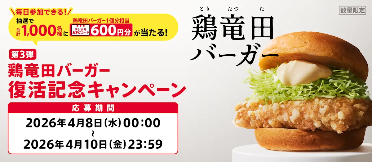 鶏竜田バーガー復活記念キャンペーン第3弾では、抽選で1,000名様に「デジタルKFCカード600円分」が当たるキャンペーンを実施します。