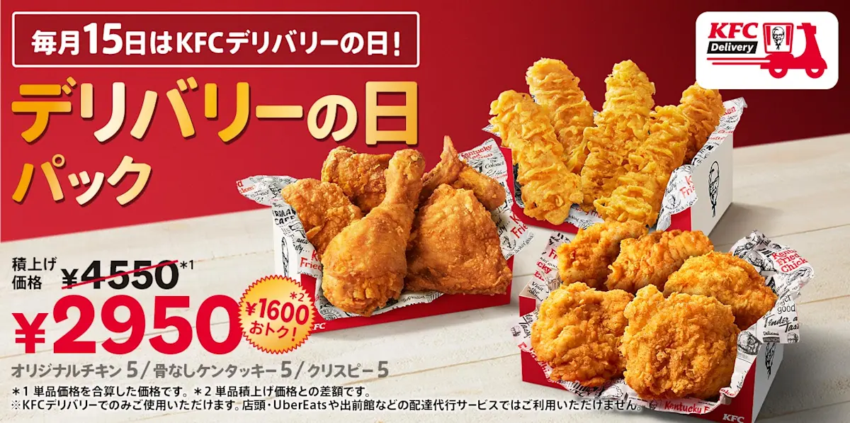 毎月15日は「デリバリーの日」!15日にちなんで全部で15ピース!デリバリーでもケンタッキーをお楽しみください。