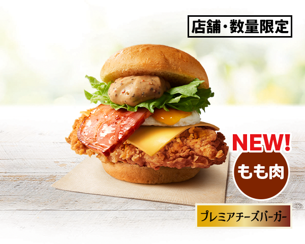 ジューシーなもも肉と一番相性の良い特製ガーリックペッパーマヨを開発し、ベーコンとまるオムレツと合わせると抜群のおいしさが際立つ満足感たっぷりのバーガーです。