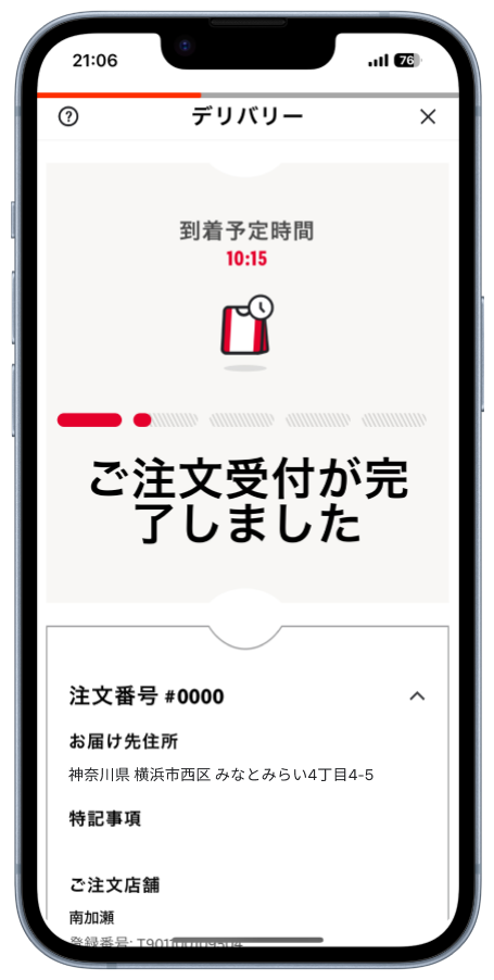 - 受け取り時間になったら指定の店舗へ行き、注文完了ページにある「店舗に到着」ボタンを押してください。